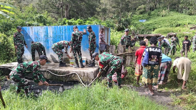 Kurima – Dalam upaya meningkatkan kesejahteraan masyarakat dan menjaga kebersihan lingkungan, anggota Bintara Pembina Desa (Babinsa) dari Koramil 1715-03/Kurima melaksanakan kegiatan bakti sosial bersama warga Kampung Polimo, Distrik Kurima. Kegiatan tersebut dilakukan pada hari Rabu (22/1/2025), yang bertujuan untuk membersihkan bak air serta memperbaiki saluran air yang mengalami penyumbatan.