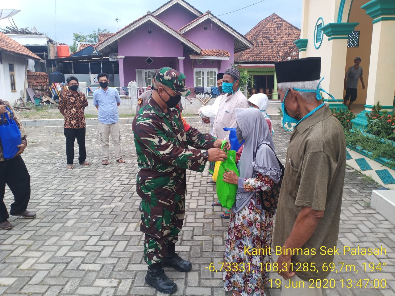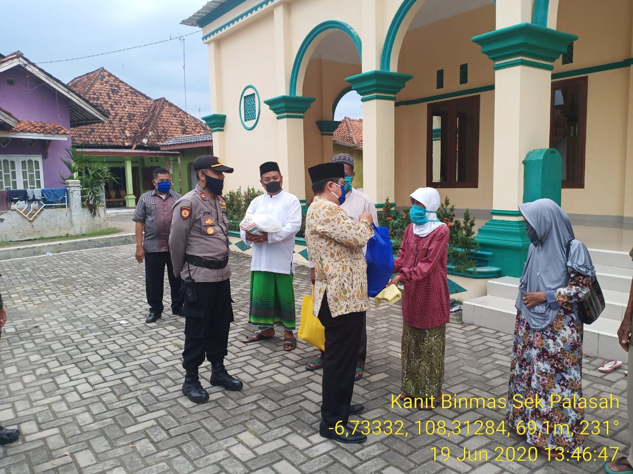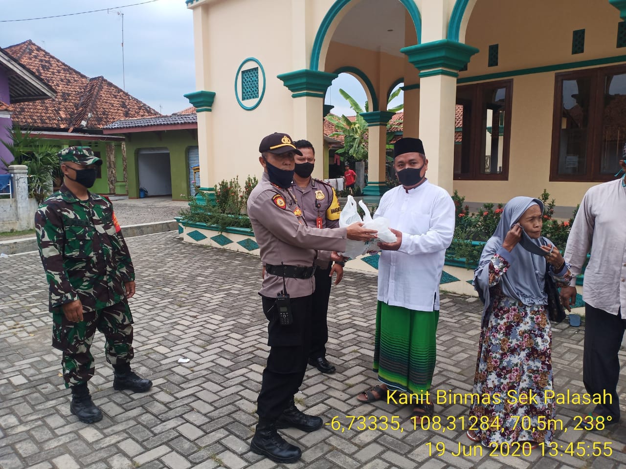 Berita Kab.Majalengka –  Kapolsek Palasah Polres Majalengka Polda Jabar IPTU Jemiran bersama Danramil Sumberjaya/Palasah yang diwakili Batiramil Peltu Dede beserta jajarannya melaksanakan Giat Bakti Sosial Polri Peduli dalam rangka Hari Bhayangkara ke 74 memberikan bantuan sarana Kontak berupa berupa Kain kapan dan Beras kepada tukang mandi Jenzah, Marbot, dan DKM Masjid Bilal bin Rabbah Desa Buniwangi Kecamatan Palasah Kabupaten Majalengka, Jumat (19/6/2020).