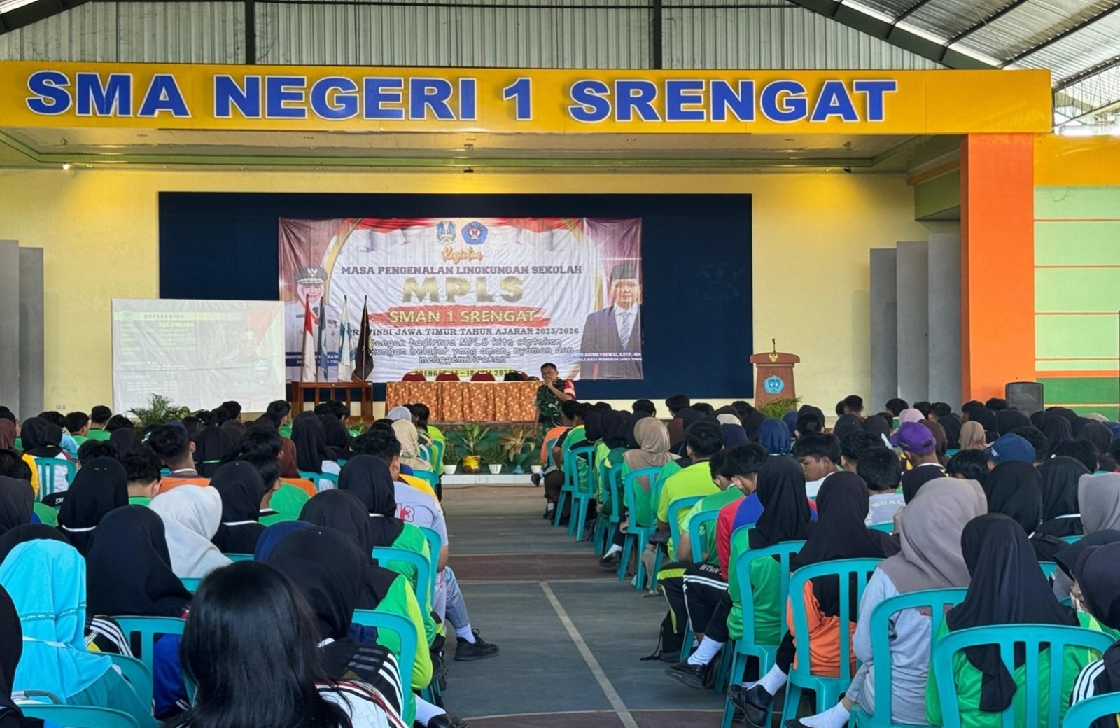 Blitar – Dalam rangka mendukung pelaksanaan Masa Pengenalan Lingkungan Sekolah (MPLS) Tahun Ajaran Baru 2025/2026, Danramil 0808/06 Srengat Kodim 0808/Blitar Kapten Inf. Sigit Armyanto beserta enam orang anggota memberikan pelatihan baris-berbaris (PBB) dan materi Wawasan Kebangsaan (Wasbang) kepada 550 siswa-siswi baru SMA Negeri 1 Srengat, bertempat di lapangan dan aula serbaguna sekolah, Selasa (15/7/2025).