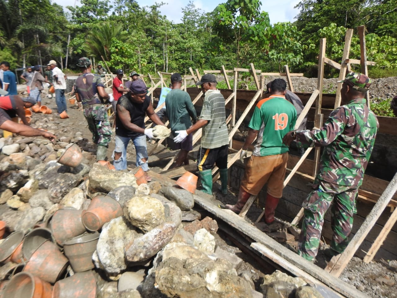 Sanana – Personel Satgas TMMD Reguler ke-123 Kodim 1510/Sula bersama masyarakat setempat bekerja keras untuk menyelesaikan proyek sasaran fisik yang berada di beberapa desa diantaranya Desa Pastina, Kecamatan Sanana, Kabupaten Kepulauan Sula. Dalam upaya tersebut, mereka terlibat langsung dalam pengisian air secara manual untuk kebutuhan adukan semen yang digunakan dalam proses pengecoran. Sabtu (22/02/2025).