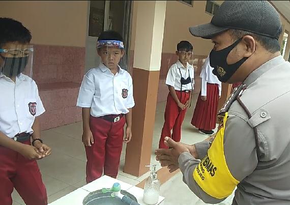 Berita Mapolres Majalengka-   Bhabinkamtibmas Polsek Bantarujeg Polres Majalengka Bripka Yosef Mulya Ependi mengajarkan cuci tangan yang baik dan benar kepada anak sekolah SDN Cikidang Kecamatan Bantarujeg Kabupaten Majalengka, Senin (24/8/2020).