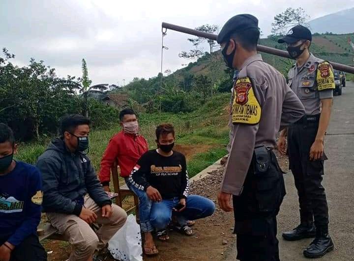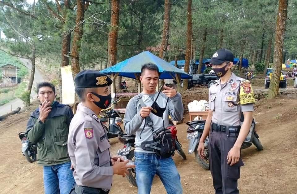 Bhabinkamtibmas Polsek Cikijing Brigpol Achmad dan Bripda Asep Indra saat menyambangi Bukit Kanaga menyempatkan diri berbincang dengan salah satu pengunjung dan menyampaikan beberapa imbauan kepada pengunjung agar selalu mematuhi protokol kesehatan saat memasuki tempat wisata, seperti selalu memakai masker dan selalu menjaga jarak antara pengunjung yang satu dengan yang lain.