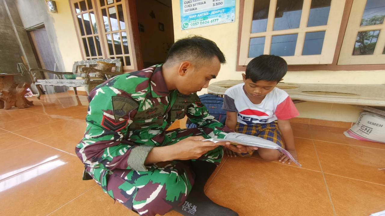 Blitar – Mencerdaskan kehidupan bangsa adalah bagian dari cita-cita kemerdekaan yang tertuang di dalam pembukaan UUD 1945. Selain pekerjaan sasaran fisik pada gelaran TMMD kali ini, dengan paruh waktu istirahatnya, kali ini Sertu Marinir Fachrul Dzil Ikram dari Pasmar 2 Resimen Kavaleri 2 Marinir yang tergabung dalam Satgas TNI Manunggal Membangun Desa (TMMD) ke – 119, berinisiatif meluangkan waktunya memberikan bimbingan belajar kepada anak-anak di sekitar rumah inapnya.