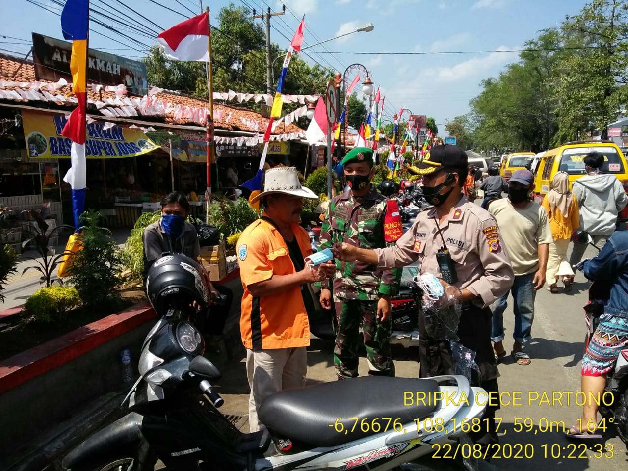 Di Pimpin Kapolsek Kadipaten KOMPOL Sukanto bersama Waka Polsek Kadipaten IPDA Rino Waluyo dan diikuti Anggota Polsek Kadipaten, Koramil serta anggota Sat Pol PP Kecamatan Kadipaten, mereka membagikan masker gratis kepada para pengunjung pasar Tradisional Kadipaten Kabupaten Majalengka, Sabtu (22/08/2020).