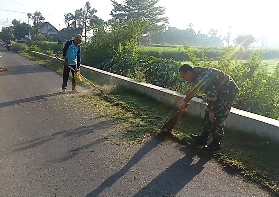 Terlihat Sertu Slamet terjun langsung ke lapangan bersama puluhan warga setempat untuk membersihkan bahu jalan dari rumput liar, sampah plastik, serta merapikan saluran air yang tersumbat.