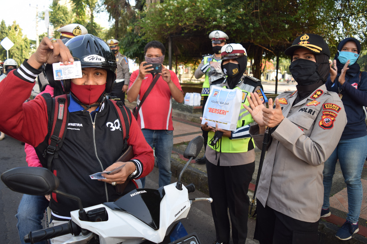 “Ya kegiatan ini dalam rangka Operasi Patuh Lodaya 2020, yang mana kami memberikan reward terhadap pengendara yang patuh, baik disiplin dalam berkendara maupun patuh terhadap protokol kesehatan” ucap Kapolres Banjar sambil memberikan hadiah kepada pengendara.