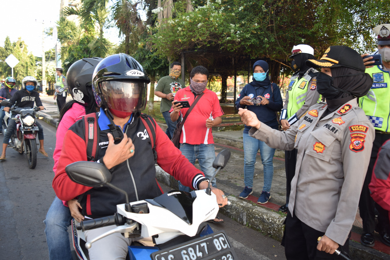 Berita Mapolres Banjar -Berlokasi di simpang 4 alun-alun Kota Banjar, Kapolres Banjar Polda Jabar AKBP Melda Yanny, S.I.K.,M.H. pimpin personil lalu lintas sosialisasi dan imbauan kepada pengguna jalan, serta berikan reward kepada pengendara yang patuh dan taat terhadap peraturan lalu lintas dan patuh terhadap protokol kesehatan. (25/7/2020).