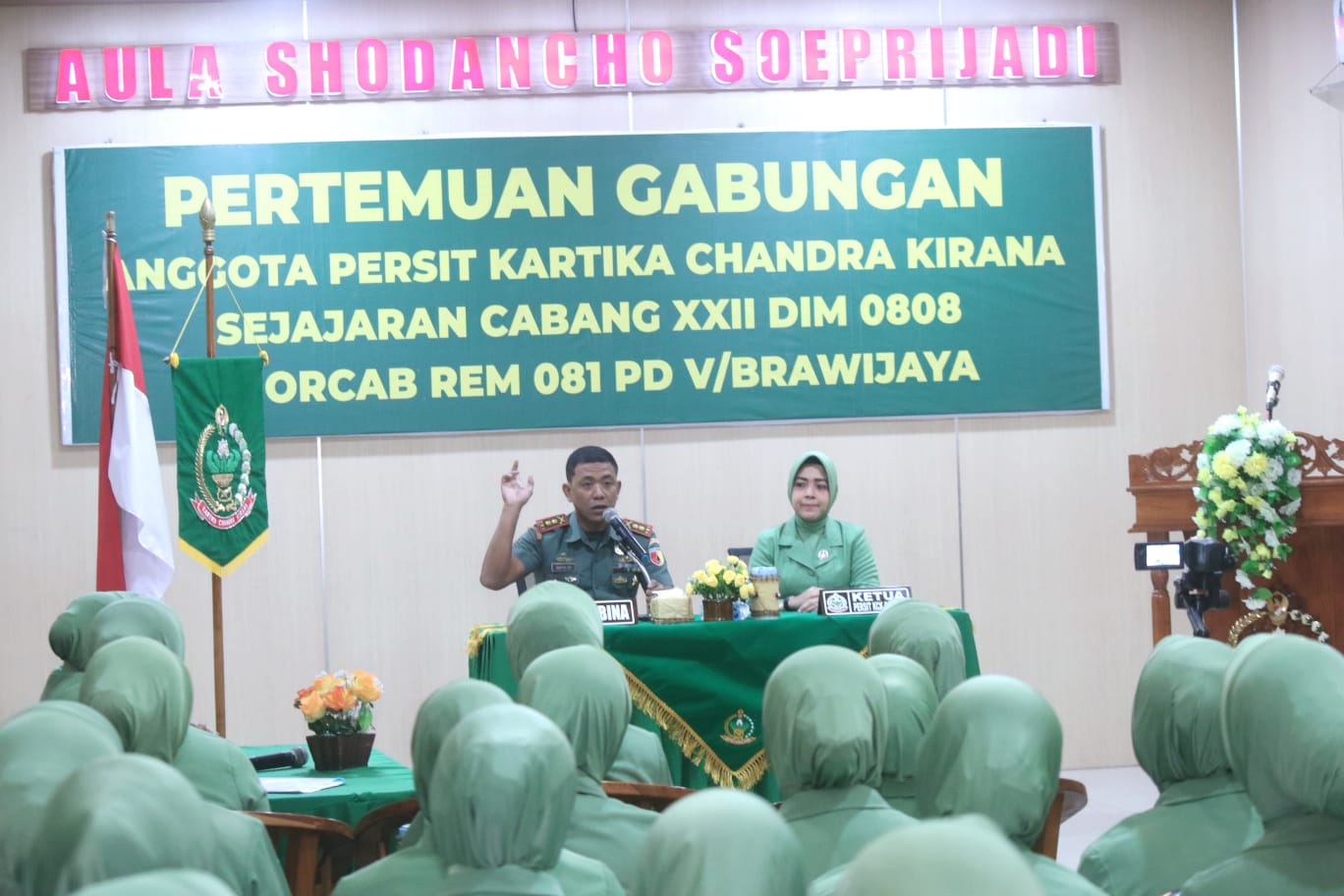 Kodim Blitar – Dandim 0808/Blitar Letkol Inf Sapto Dwi Priyono, S.E., di dampingi Ketua Persit KCK Cabang XXII Ny. Vivi Sapto Dwi Priyono, pada pertemuan gabungan anggota Persit KCK Sejajaran Cabang XXII Dim 0808 Koorcab Rem 081 PD V/Brawijaya, memberikan pengarahan kepada anggota Persit KCK Cabang XXII, bertempat di Aula Shodancho Soeprijadi Kodim 0808, Jl. A. Yani No. 06 Kel/Kec. Kepanjenkidul Kota Blitar, Selasa (8/8/2023).