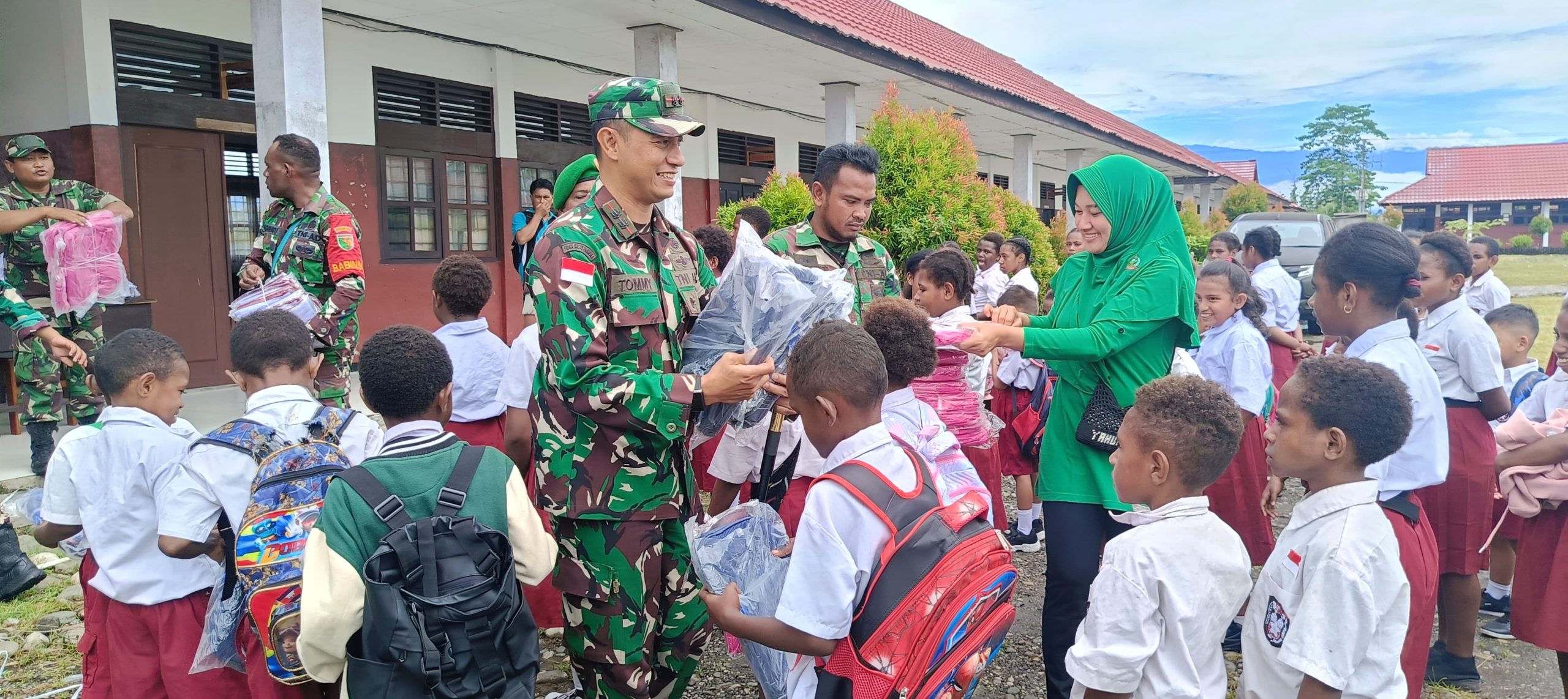 Dandim 1715/Yahukimo Serahkan Bantuan KASAD Tas dan Seragam Sekolah kepada Anak Sekolah di Dekai Yahukimo