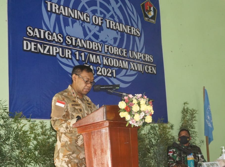 Berita Mearuke–Komandan Pusat Misi Pemeliharaan Perdamaian (PMPP) TNI Marsma TNI Benedictus Benny K.S.H, MAv Mgt, MAIR didampingi oleh Danrem 174 Merauke Brigjen TNI Bangun Nawoko membuka pelatihan Training Of Trainers (TOT) dalam rangka latihan persiapan Satgas Standby Force UNPCRS TA. 2021, bertempat di Mako Detasemen Zeni Tempur 11/MA, Jln. Poros Tanah Miring, Kab. Merauke, Papua, Kamis (05/08/2021).