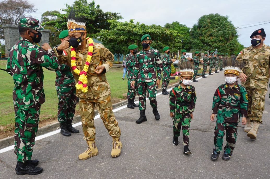 Saat kunjung kerja di Detasemen Zeni Tempur (Denzipur) 11/MA, Komandan PMPP TNI beserta rombongan menerima jajar kehormatan dan disambut dengan tarian adat.