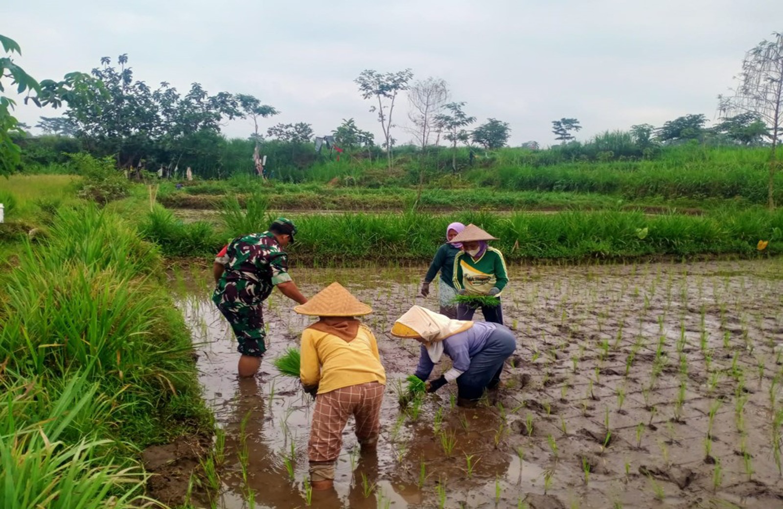 Blitar – Dalam rangka mendukung program ketahanan pangan di wilayah binaannya, Serda Nur Hatib Babinsa Koramil 0808/15 Gandusari, pagi ini melaksanakan kegiatan membantu anggota Kelompok Tani Margo Rukun menanam bibit padi jenis inpari di area persawahan, yang berlokasi di Desa Soso Kec. Gandusari Kab. Blitar, Senin (9/9/2024).