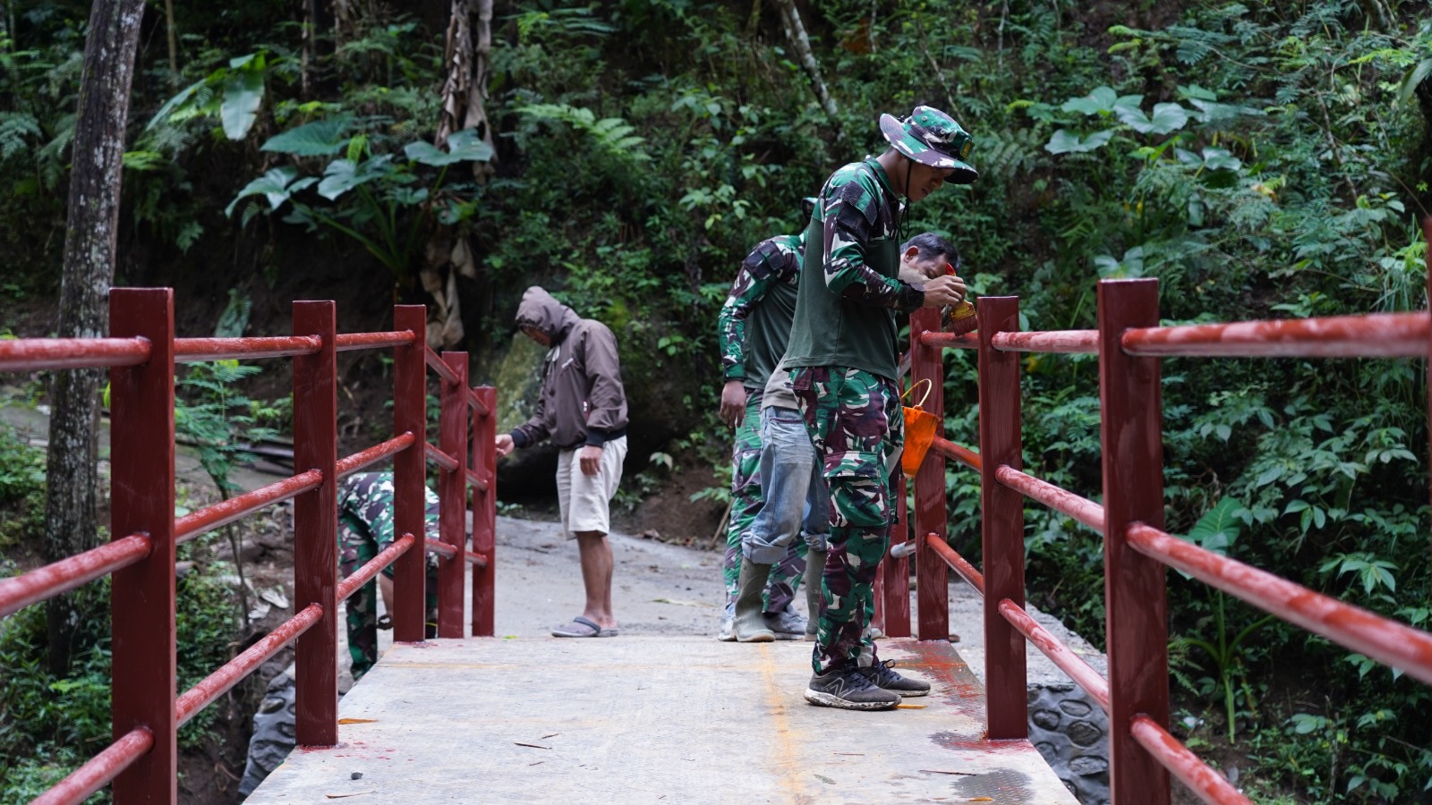 Pengecatan dilakukan secara gotong royong oleh Satgas TMMD bersama warga sekitar. Kegiatan ini bertujuan memperindah tampilan jembatan sekaligus melindungi material dari pengaruh cuaca agar usia pakai jembatan lebih panjang dan aman digunakan.