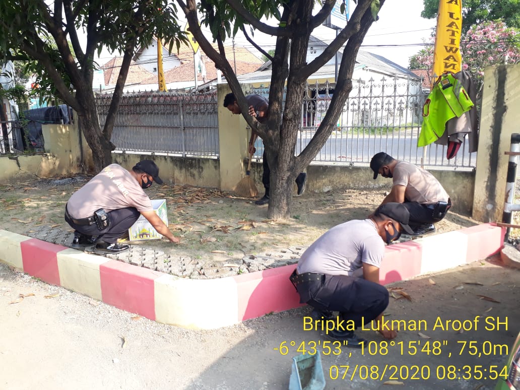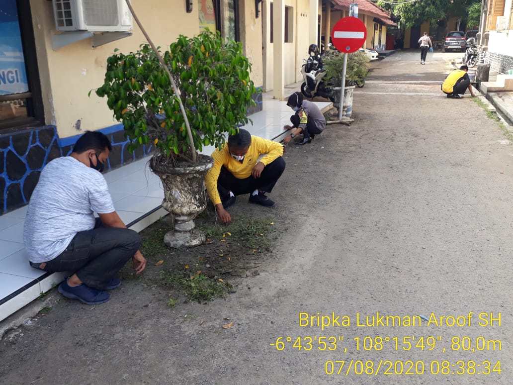 Berita Mapolres Majalengka –– Personel Polsek Jatiwangi, Polres Majalengka dipimpin langsung Kapolsek Jatiwangi KOMPOL Asep S.Fiqih,S.H.,M.H, setelah melaksanakan apel pagi dilanjutkan dengan kegiatan Korve gotong royong membersihkan lingkungan Mapolsek Jatiwangi, Jumat (7/8/2020).