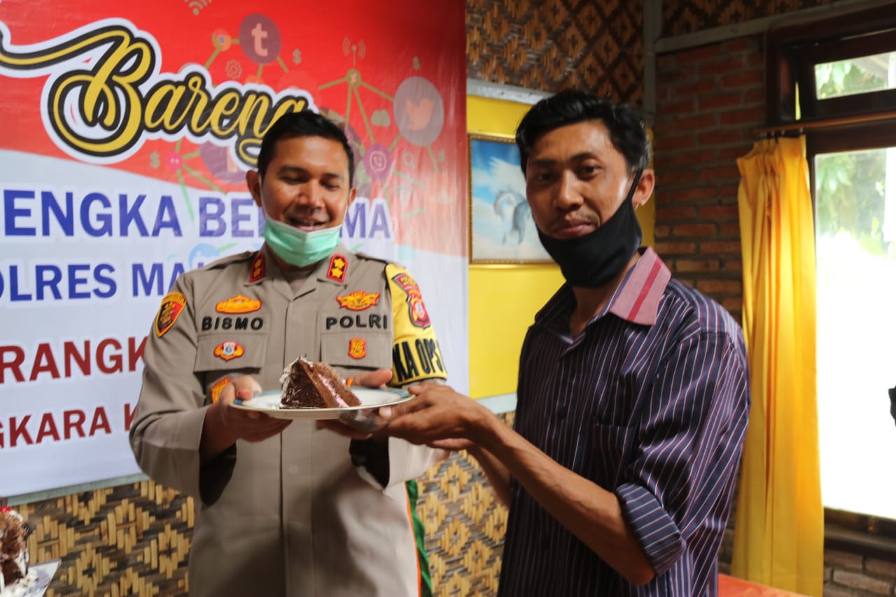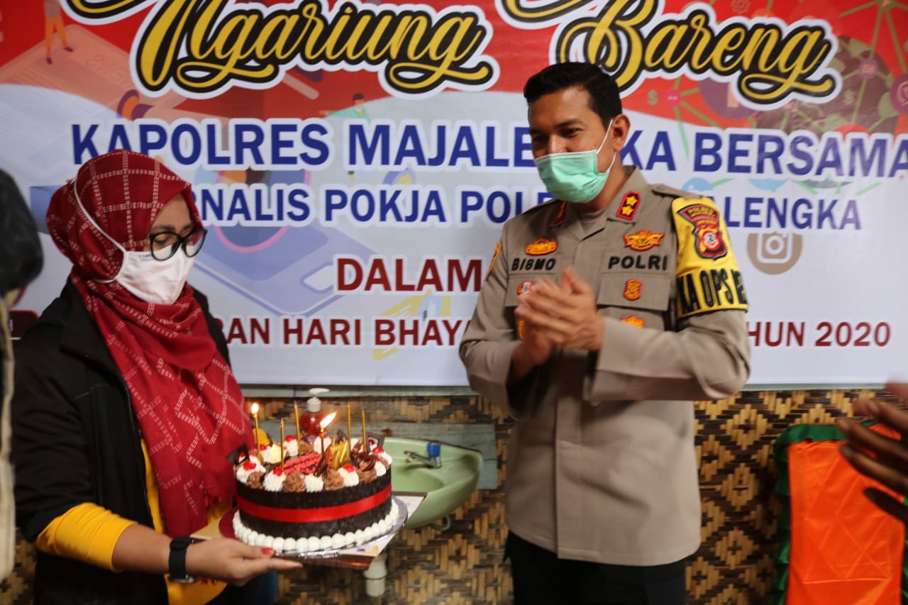 Disela kegiatan Ngariung Bareng tersebut, Ketua Pokja Jurnalis Polres Majalengka, Jaja Sumarja, memberikan kejutan kepada Kapolres Majalengka di Hari Bhayangkara ke-74 dengan memberikan hadiah kue.