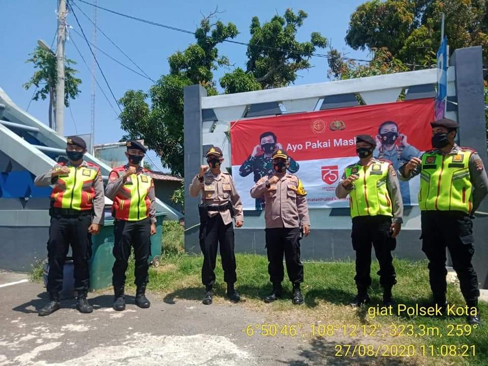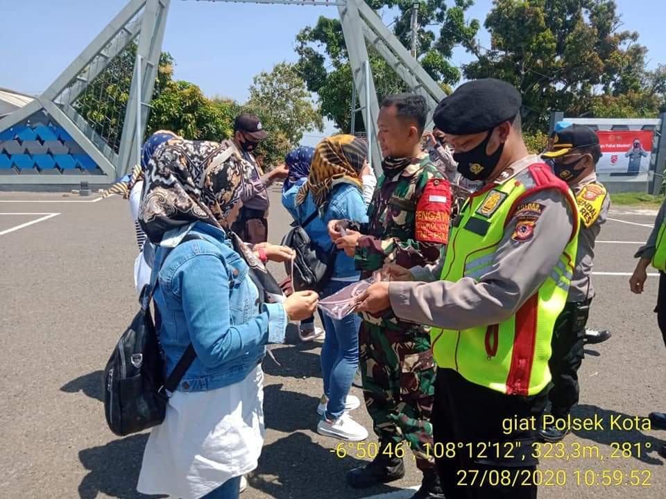 Kabag Ops Polres Majalengka KOMPOL M.Pardede didampingi Kapolsek Majalengka Kota AKP Kustadi bersama unsur TNI memberikan himbauan dan bagikan Masker Gratis kepada Pengunjung Obyek Wisata Paralayang Majalengka, Kamis (27/8/2020).