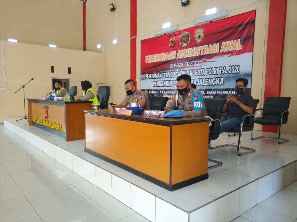 Berita Mapolres Majalengka – Dalam rangka pelaksanaan penerimaan terpadu anggota Polri T.A. 2020 (Tamtama, Brigadir, Akpol), Pembukaan Pemeriksaan Administrasi Awal Para Calon Peserta Seleksi Penerimaan Bintara Polri T.A. 2020 Bertempat di Gedung Serba Guna Sarja Arya Racana Polres Majalengka, Jumat (21/8/2020).