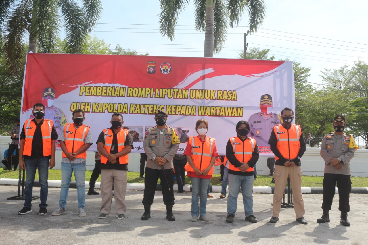 Berita Mapolda Kalteng) — Sebagai bentuk perhatian terhadap insan pers di Kalimantan Tengah untuk menunjang tugas jurnalistik, Kapolda Kalteng Irjen Pol Dr Dedi Prasetyo memberikan rompi khusus pers peliputan aksi Demo di halaman Gedung DPRD Provinsi Kalimantan Tengah, Senin (12/10/2020).