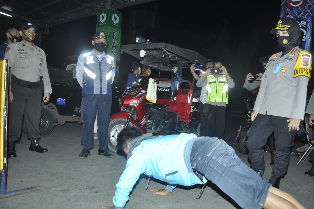 Ada lagi yang berorasi di pinggir simpang 4 alun-alun, ada juga yang disuruh mendorong sepeda motornya dan sambil mengucapkan ‘saya tidak pakai masker, saya berjanji akan menggunakan masker’.(rilis/jepri)