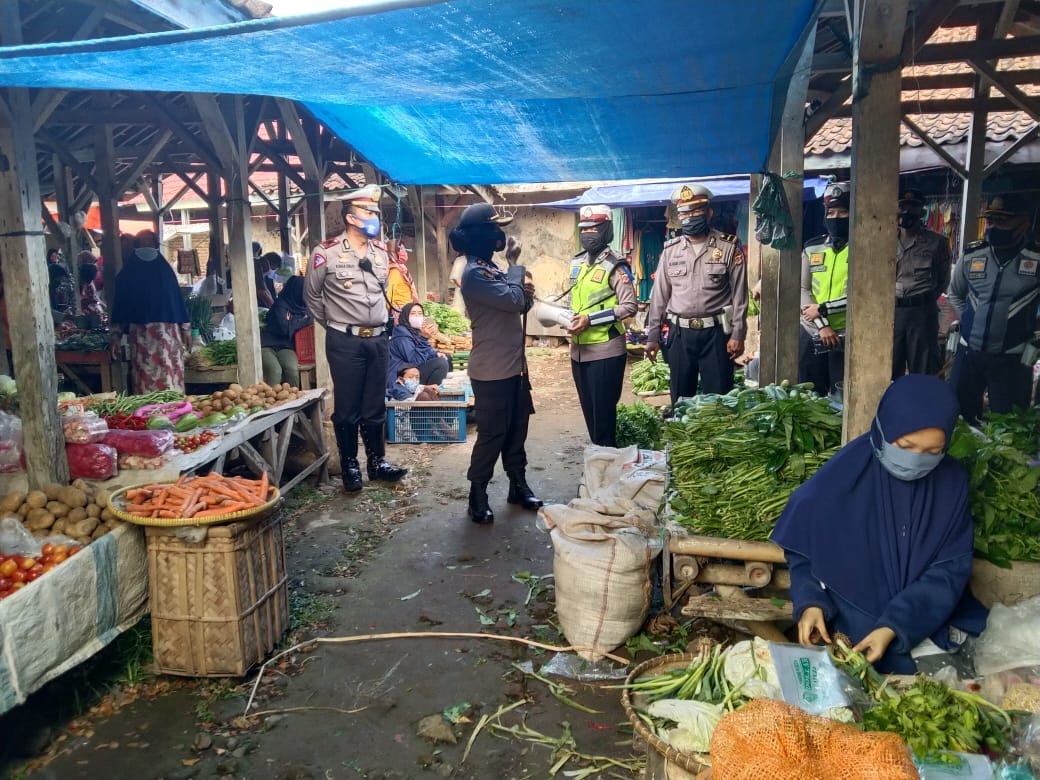 Kapolres Banjar bersama Satuan Lalu Lintas Polres Banjar Berikan Himbauan Protokol Kesehatan Di Pasar