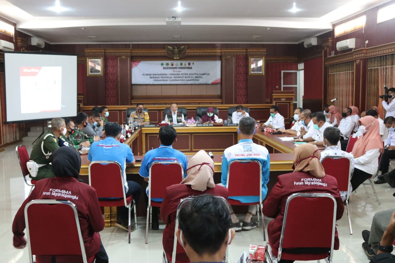 Berita Mapolres MAJALENGKA, Menindaklanjuti perkembangan Pro dan Kontra penetapan Undang-Undang Omnibus Law Cipta Kerja, Kapolres Majalengka AKBP Dr. Bismo Teguh Prakoso bersama Forkopimda Kabupaten Majalengka menggelar silaturrahmi dan dialog dengan Serikat Pekerja dan Buruh Se Kabupaten Majalengka bertempat di Gedung Yudha Karya Abdi Negara Setda Kabupaten Majalengka, Rabu (21/10/2020).