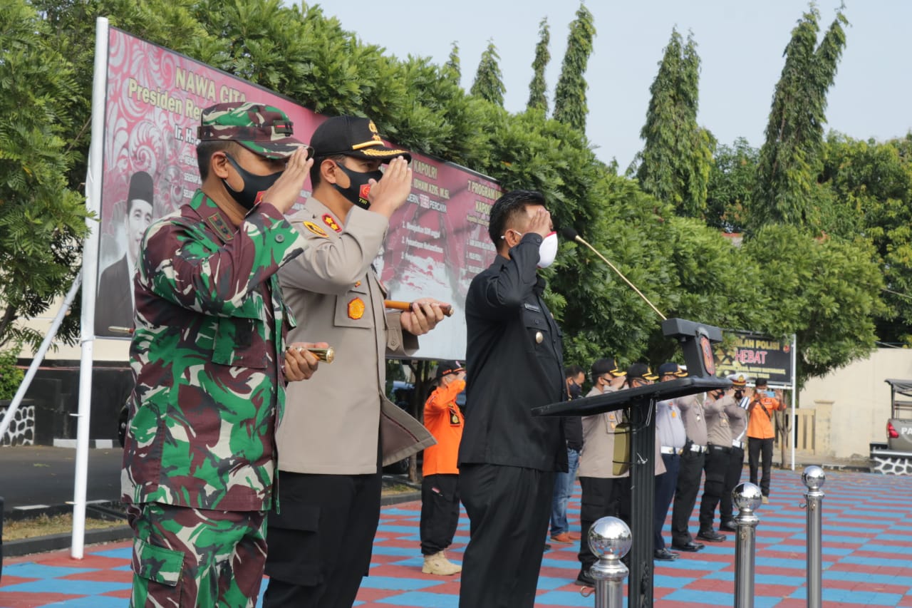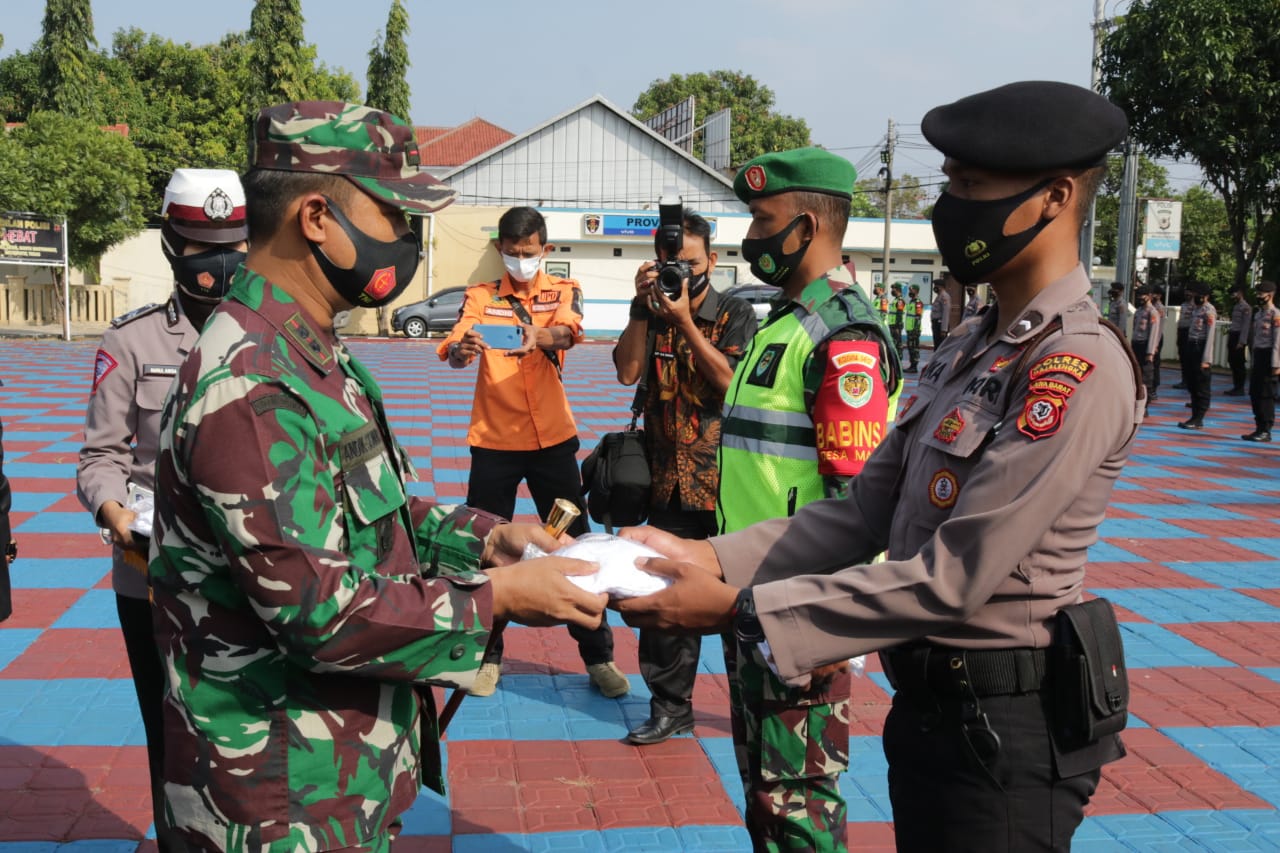 Berita Mapolres MAJALENGKA -, Kapolres Majalengka AKBP Dr.Bismo Teguh Prakoso dengan didampingi Wakil Bupati Majalengka Tarsono D Mardiana dan Dandim 0617 Majalengka Letkol Inf. Andik Siswanto pimpin apel kesiapan pembagian masker secara serentak, kampanye jaga jarak dan hindari kerumunan bersama Forkopimda Kabupaten Majalengka Diwilayah Kabupaten Majalengka dalam rangka Pendisiplinan masyarakat untuk mematuhi protokol kesehatan covid-19.
