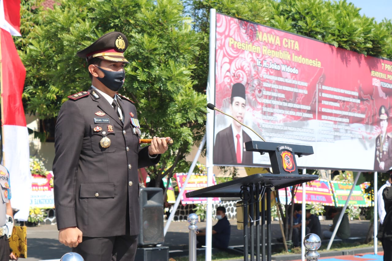 Berita Mapolres Majalengka — Kapolres Majalengka AKBP Dr.Bismo Teguh Prakoso saat memimpin upacara korps raport bagi Perwira dan Bintara Polres Majalengka yang mendapat kenaikan pangkat satu tingkat lebih tinggi dari pangkat sebelumnya bertempat di lapangan Apel Mapolres Majalengka, Rabu (1/7/2020) pagi.