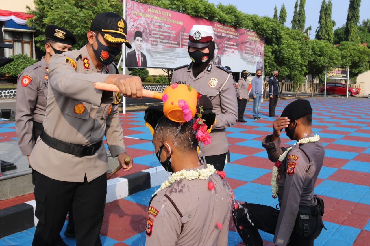 Rangkaian kegiatan pembinaan tradisi diakhiri dengan Upacara penyiraman air kembang dan penyematan baret secara simbolis oleh Kapolres Majalengka dan Waka Polres Majalengka pada sore ini, Sabtu (8/8/20) di halaman Mapolres Majalengka.