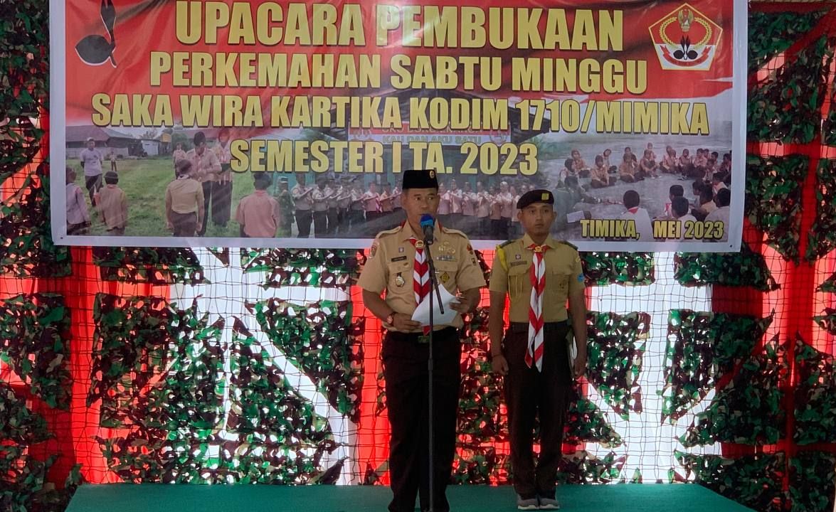 Baraknews Timika — Kasdim 1710/Mimika Mayor Inf Abdul Munir wakili Dandim 1710/Mimika pimpin upacara pembukaan Persami Pramuka Saka Wira Kartika, bertempat di Pendopo Darmawangsa Kodim 1710/Mimika Jl. Agimuga Mile 32, Distrik Kuala Kencana, Kab. Mimika, Sabtu (27/05/2023).