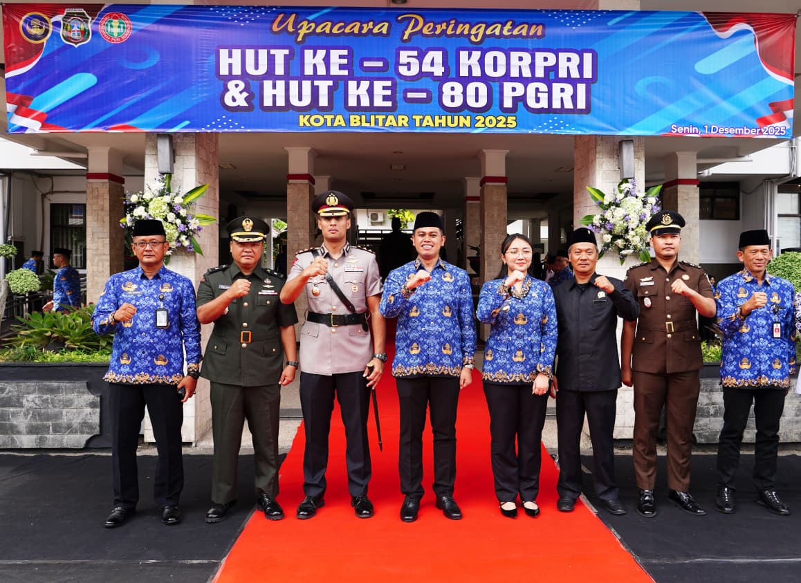 Blitar – kepala Staf Kodim 0808/Blitar Mayor Inf Imam Suyoso menghadiri Upacara Peringatan HUT Korp Pegawai Republik Indonesia (Korpri) ke- 54 dan HUT PGRI ke 80 Tahun 2025 di Halaman Kantor Walikota Blitar, Senin (01/12/2025).