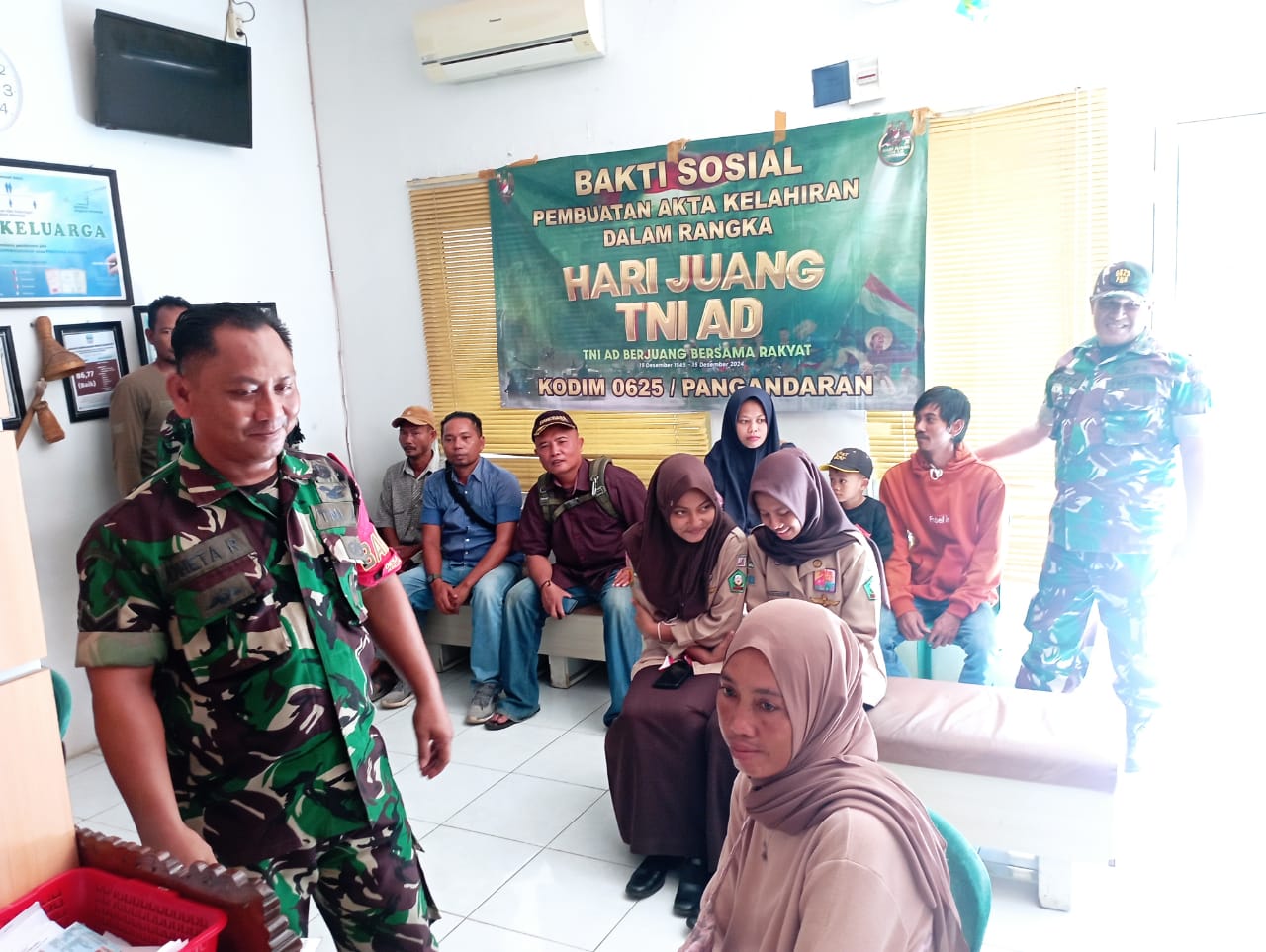 Pangandaran, 13 Desember 2024 – Dalam rangka memperingati Hari Juang TNI Angkatan Darat ke-79 yang bertemakan “TNI AD Berjuang Bersama Rakyat”, Kodim 0625/Pangandaran melaksanakan kegiatan bakti sosial berupa layanan bantuan pembuatan akta kelahiran bagi warga. Kegiatan ini berlangsung di Kantor Dinas Kependudukan dan Catatan Sipil Kabupaten Pangandaran, yang berlokasi di Jalan Pananjung No. 412, Desa Pananjung, Kecamatan Pangandaran, Kabupaten Pangandaran.