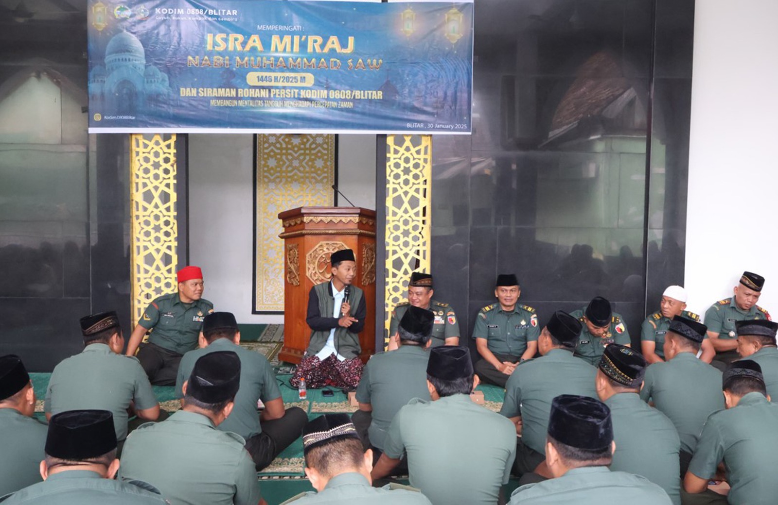 Blitar – Kodim 0808/Blitar menggelar peringatan Isra Mi’raj Nabi Muhammad SAW 1446 H/2025 M yang dirangkaikan dengan siraman rohani bagi prajurit dan Persit. Acara ini mengusung tema “Membangun Mentalitas Tangguh Menghadapi Percepatan Zaman” dan berlangsung di Masjid Al Ikhlas Kodim 0808/Blitar, Jl. A. Yani Kelurahan/Kecamatan Kepanjenkidul Kota Blitar, Kamis (30/1/2025).