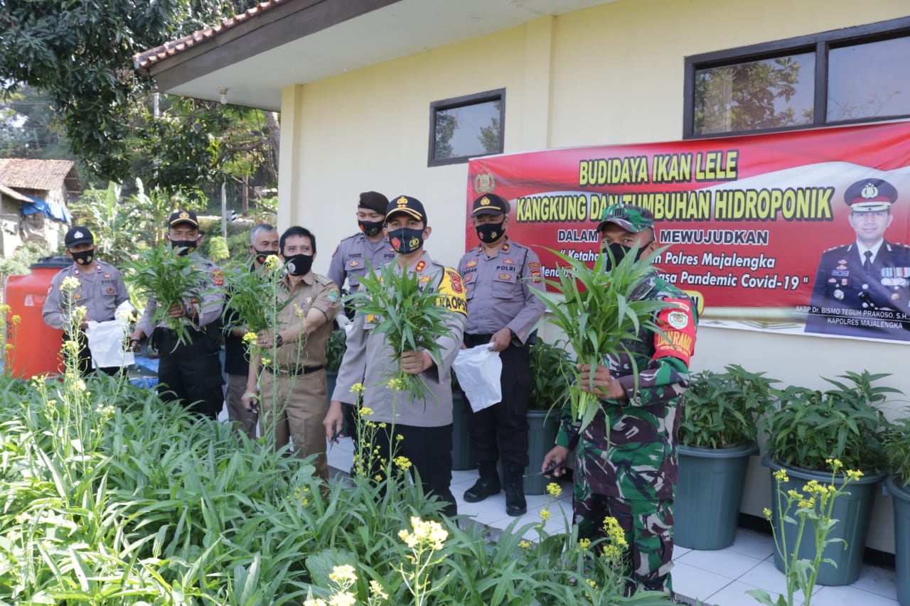 Berita Mapolres Majalengka–Kapolres Majalengka AKBP Dr. Bismo Teguh Prakoso didampingi Kapolsek Banjaran AKP Dundun Kusmalyadi, KBO Sat Binmas IPTU Baban Kurbandi melaksanakan panen sayuran kangkung dan Budidaya Ikan lele yang bertempat di lingkungan Mapolsek Banjaran Polres Majalengka, Selasa (8/9/2020).