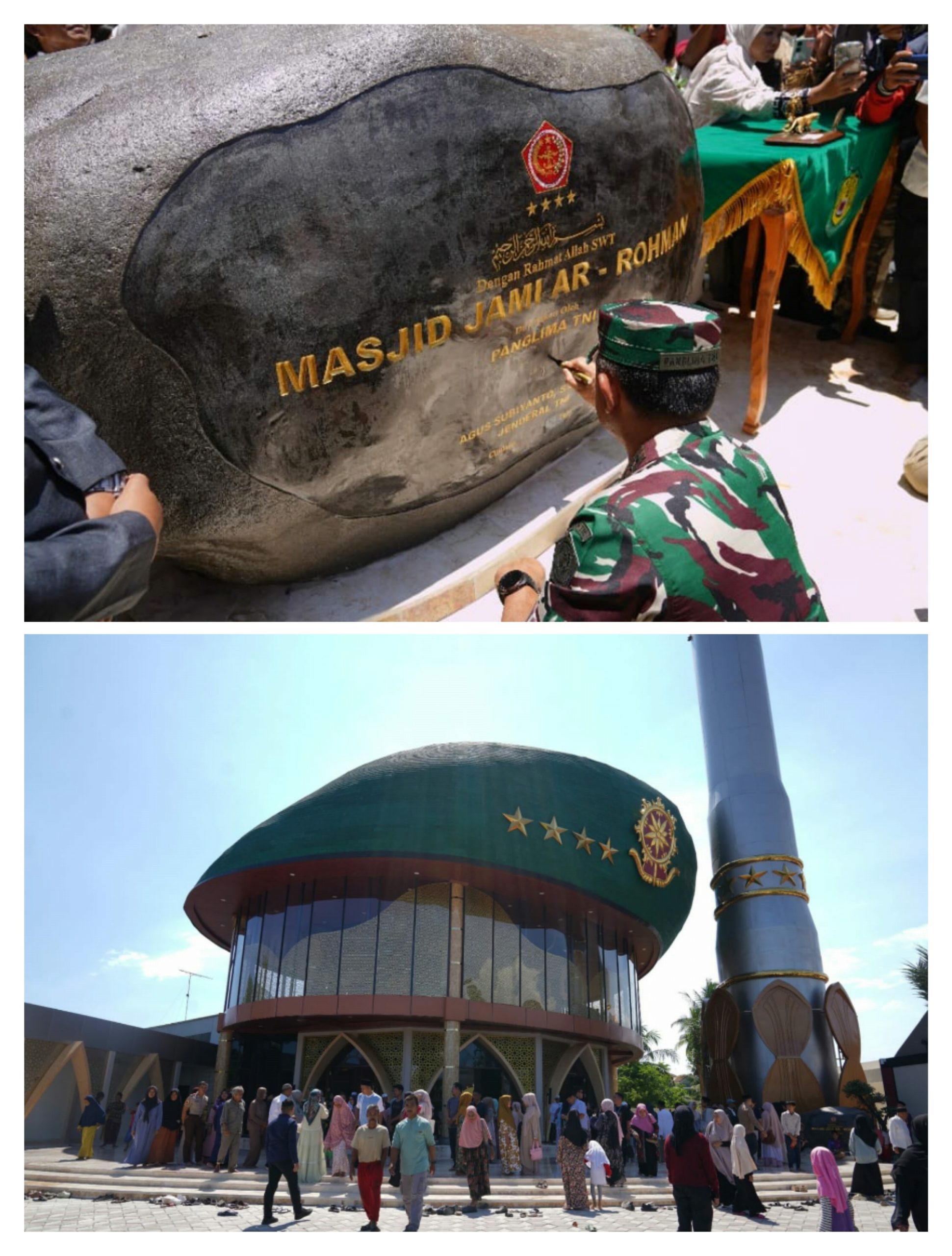 (Puspen TNI). Panglima TNI Jenderal TNI Agus Subiyanto didampingi Ketua Umum Dharma Pertiwi Ny. Evi Agus Subiyanto meresmikan Masjid Jami Ar-Rohman dengan menghadirkan penceramah Ustaz Dr. Adi Hidayat, Lc., MA., bertempat di Dusun Haurseah, Cijulang, Pangandaran, Jawa Barat, Sabtu (01/03/2025).