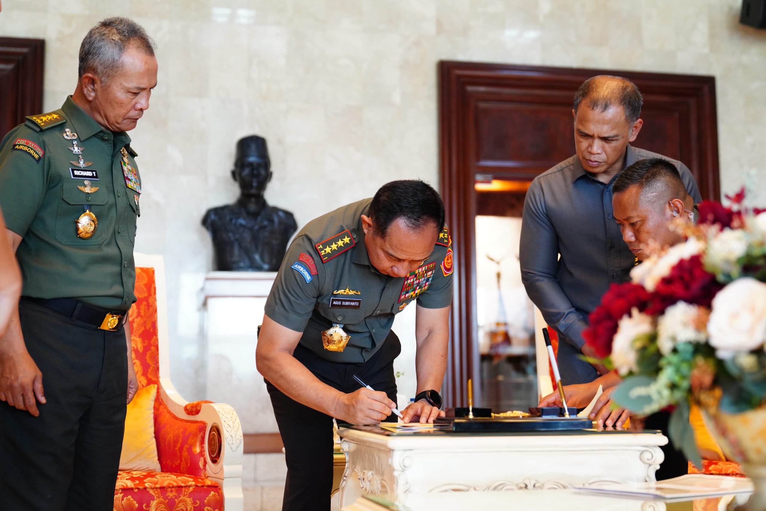 (Puspen TNI). Panglima TNI Jenderal TNI Agus Subiyanto menandatangani Nota Kesepahaman _Memorandum of Understanding_ (MoU) dengan Menteri Pertahanan, Kepala Badan Pengawasan Keuangan dan Pembangunan (BPKP), Jaksa Agung Republik Indonesia tentang dukungan pelaksanaan tugas dan fungsi dalam rangka pengamanan, perlindungan dan pengawasan kekayaan negara, bertempat di Mabes TNI, Cilangkap, Jakarta Timur, Kamis (28/11/2024)