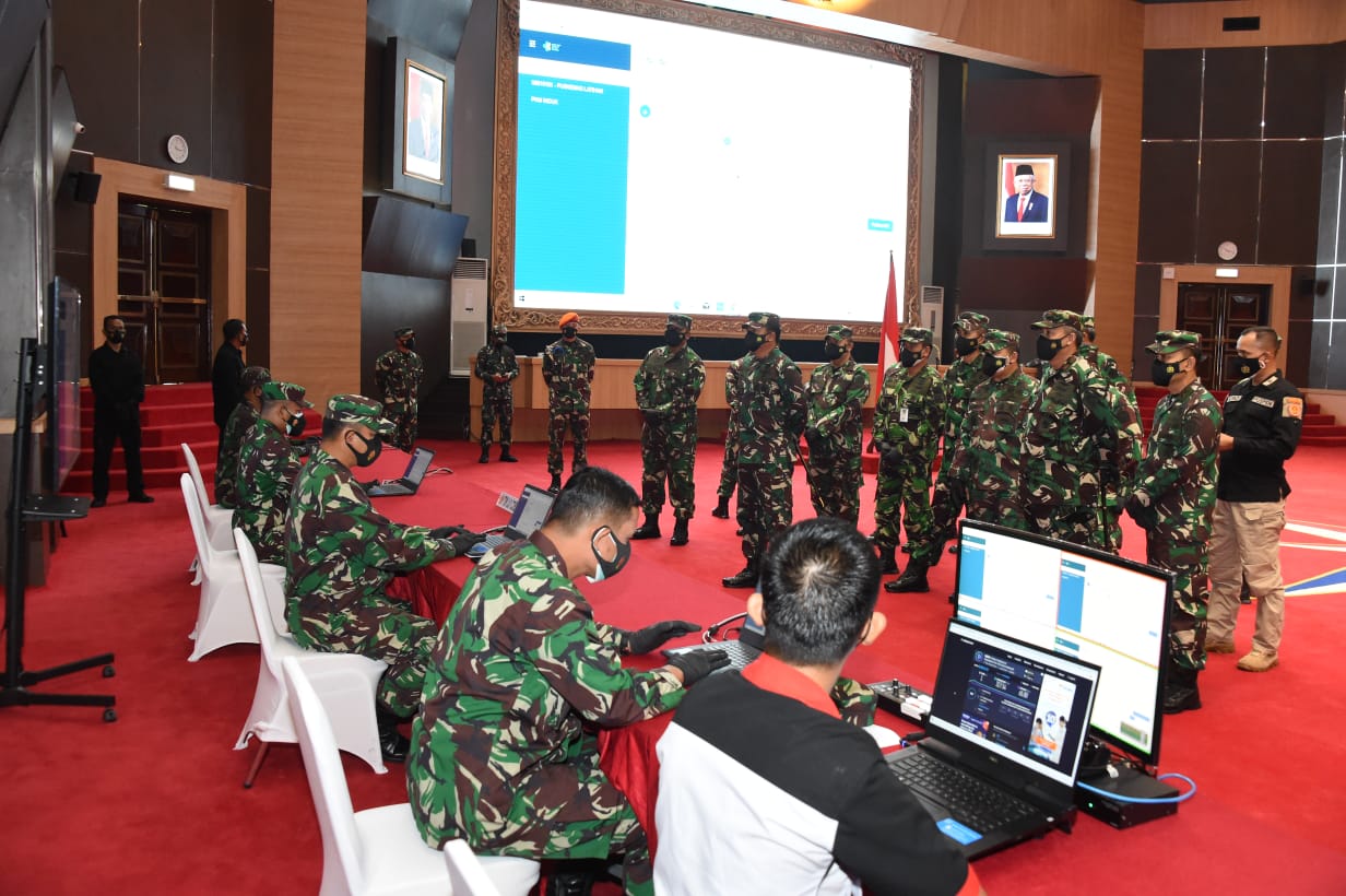 Berita Puspen TNI— Panglima TNI Marsekal TNI Hadi Tjahjanto, S.I.P. menyerahkan Laptop secara simbolis kepada Bintara Pembina Desa (Babinsa) TNI AD, Bintara Pembina Potensi Maritim (Babinpotmar) TNI AL, dan Bintara Pembina Potensi Dirgantara (Babinpotdirga) TNI AU, yang akan melaksanakan tugas sebagai tenaga Tracer Digital Covid-19, bertempat di Aula Gatot Soebroto Mabes TNI, Cilangkap, Jakarta Timur, Selasa (27/7/2021).