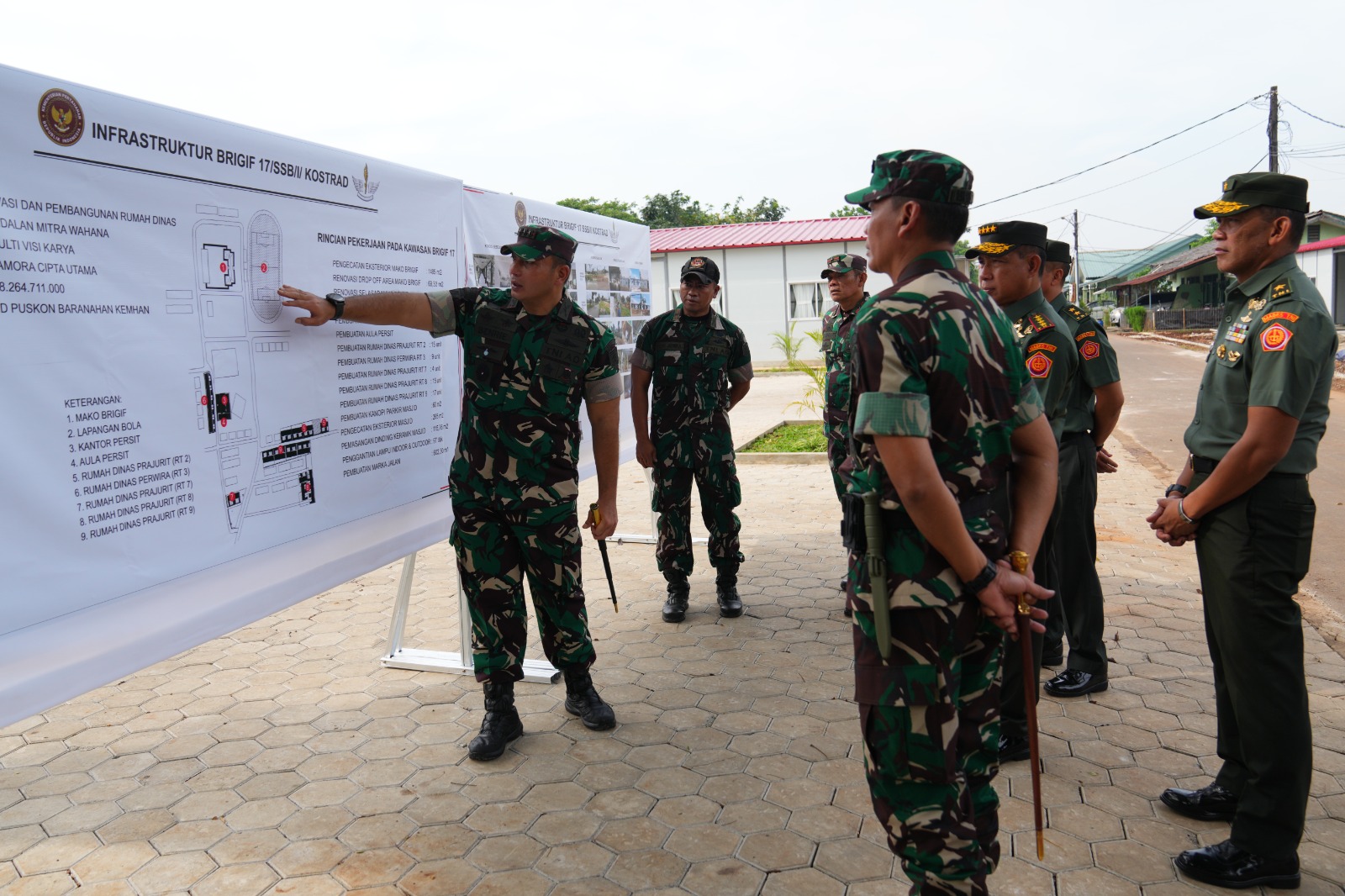 Dalam kunjungannya, Panglima TNI menerima paparan dari Danbrigif 17/Kostrad Kolonel Inf Mohammad Benrieyadin, serta meninjau langsung pembangunan sejumlah fasilitas, antara lain 60 unit rumah dinas prajurit, aula dan kantor Persit Kartika Chandra Kirana, renovasi selasar Mako Brigif, dan lapangan sepak bola.
