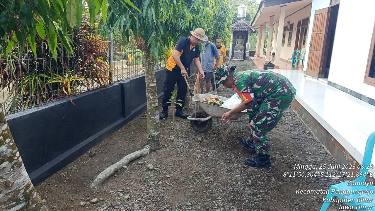 Baraknews Kodim Blitar – Untuk menjaga kekompakan dan kebersamaan di wilayah, Babinsa Koramil 0808/18 Panggungrejo Serda Sukiswanto bersama anggota Polsek Panggungrejo dan warga masyarakat, melaksanakan kegiatan kerja bakti pembersihan dan pengecatan pagar Vihara Boddhi Amatta, bertempat di Dusun Lungurtimo Desa Bumiayu Kec. Panggungrejo Kab. Blitar, Minggu (25/6/2023).