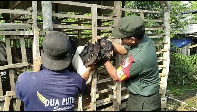 Baraknews Kodim Blitar – Babinsa Koramil 0808/10 Kademangan Kodim 0808/Blitar Serka M.Saifudin, melaksanakan kegiatan pendampingan vaksinasi PMK yang dilakukan oleh Dinas Peternakan Kab.Blitar di wilayah binaannya, bertempat di Desa Sumberjo Kec. Kademangan Kab. Blitar, Kamis (4/5/2023).