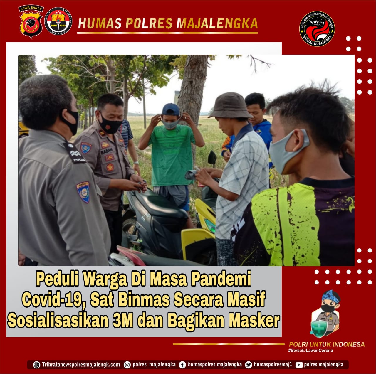 Kapolres Majalengka AKBP Dr.Bismo Teguh Prakoso melalui Kapolsek Cikijing KOMPOL Toto Sumarto, menjelaskan bahwa selain melaksanakan patroli antisipasi gangguan kamtibmas, anggotanya juga menyempatkan melakukan kegiatan antisipasi penyebaran Covid-19 dengan cara memberikan himbauan 3M dengan pembagian masker gratis untuk warga.