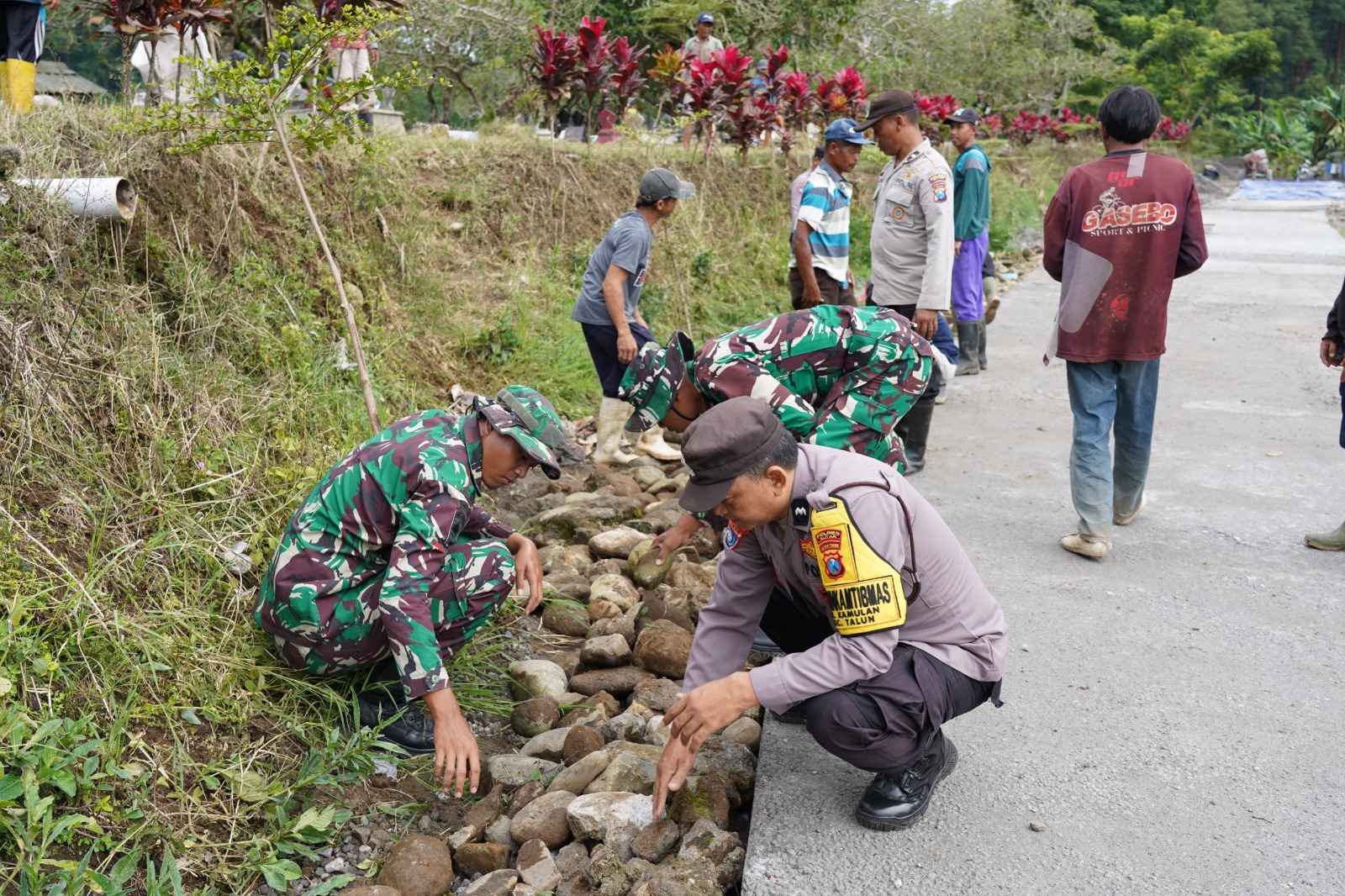 Anggota Satgas TMMD Ke 127 Kodim 0808/Blitar bersama warga melaksanakan gotong royong untuk pemasangan berem jalan sebagai bagian dari tahapan penyempurnaan pembangunan infrastruktur jalan yang menghubungkan dusun krisik dan dusun wonorejo Desa Krisik Kecamatan Gandusari Kabupaten Blitar
