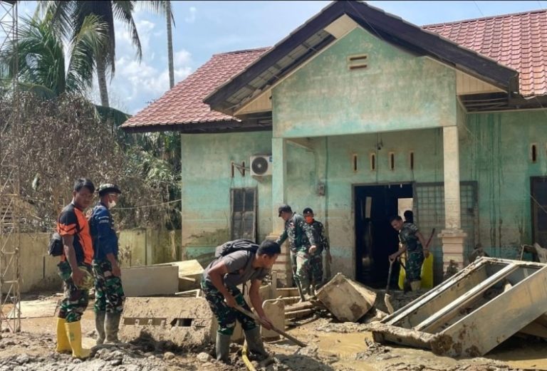 Para prajurit bergerak cepat membersihkan endapan lumpur setebal 1-3 Meter yang menutupi lantai dan halaman kantor. Dengan menggunakan alat peralatan zeni (Alpalzi) dan mesin pompa air, personel menyemprot sisa-sisa kotoran guna memastikan kebersihan ruang pelayanan publik. Fokus utama kegiatan ini adalah memulihkan fasilitas kantor agar fungsi administrasi pemerintahan desa di Karang Baru dapat segera beroperasi kembali untuk melayani warga.