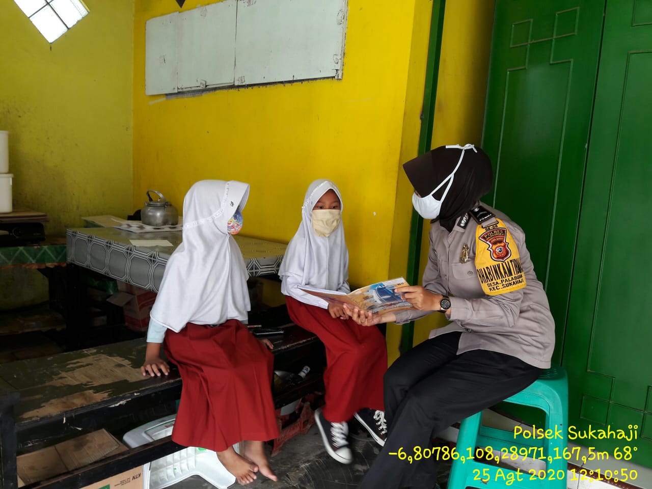 Terpantau Bhaninkamtibmas Polsek Sukahaji Polres Majalengka Bripka Ajud Tajudin bersama Bripda Nia Sri Kusnindar melaksanakan kegiatan pembinaan dan penyuluhan tentang pencegahan Protokol Kesehatan dimasa Pandemi Covid-19 dan bergerak menyasar ke tempat – tempat Pelajar dilingkungan Sekolah Dasar Negeri Desa Sangkanhurip Kecamatan Sukahaji Kabupaten Majalengka, Selasa (25/8/2020).