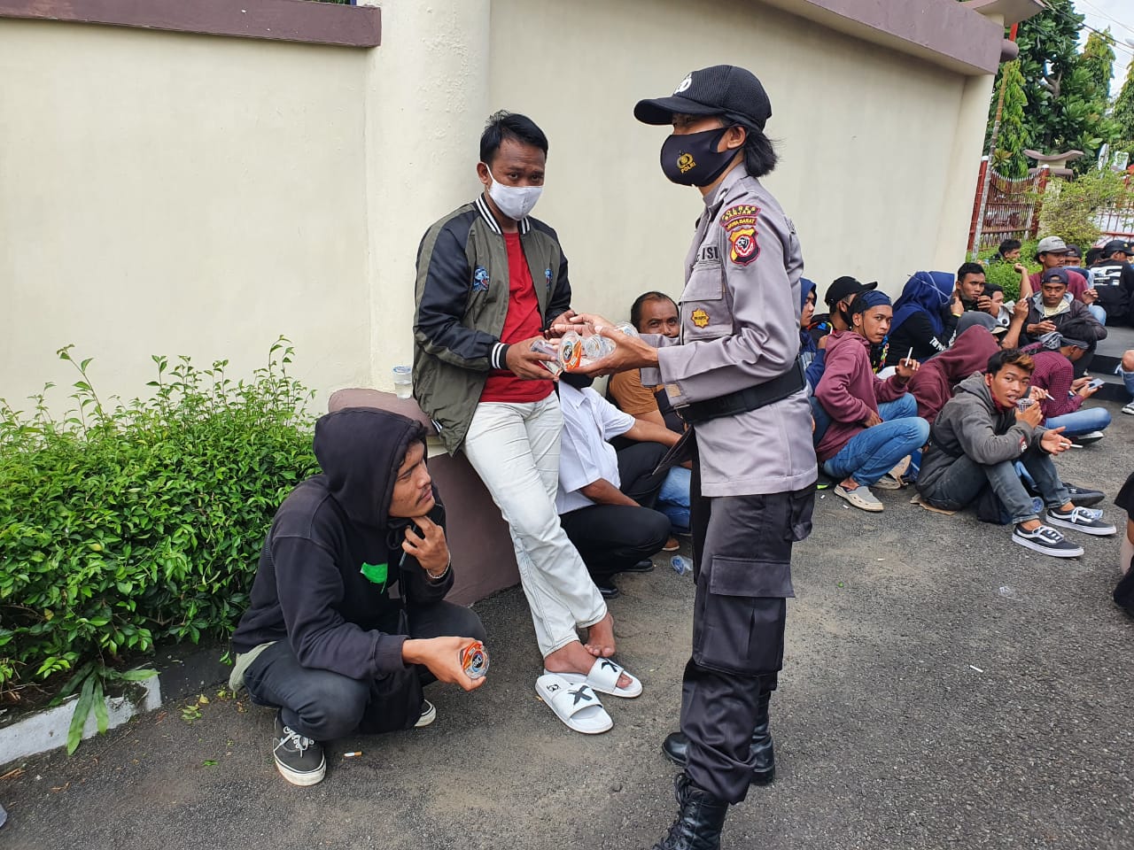 Terpantau di lapangan, Personil Polwan Polres Banjar memberikan air mineral kepada para peserta unjuk rasa.ersonil Sat Pol PP.