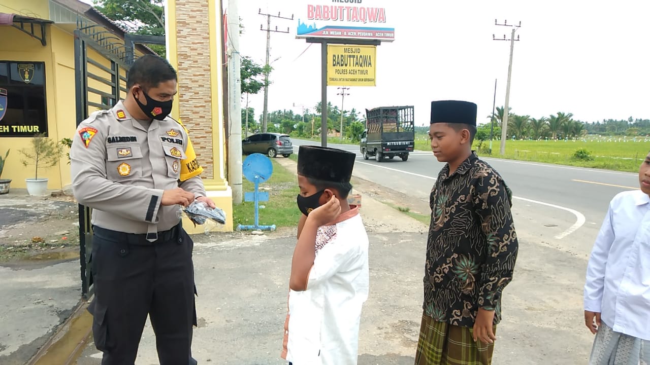 Polres Aceh Timur Bagikan Masker Kepada Jama’ah Sholat Jum’