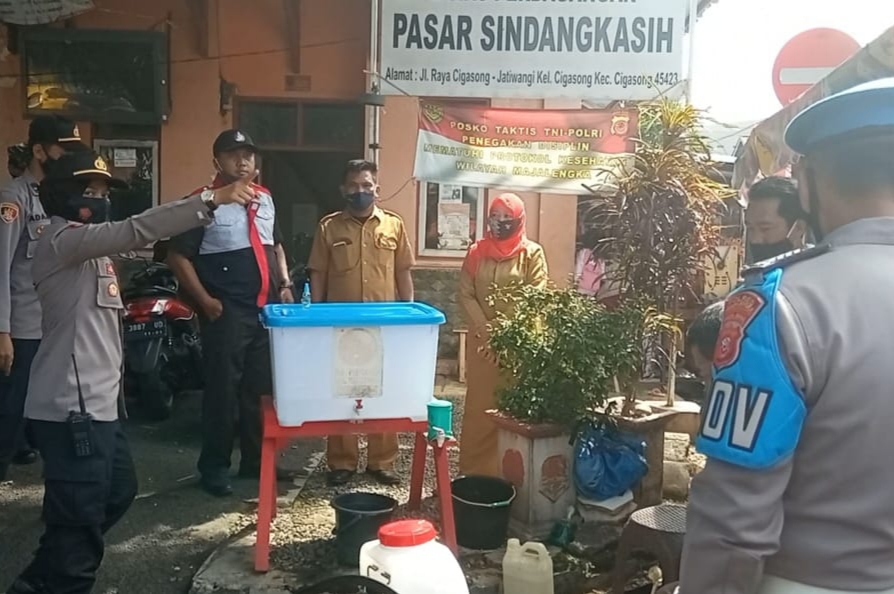 Polsek Cigasong Sosialisasikan 3M Sekaligus Semprot Disinfektan di Lokasi Pasar Guna Cegah Penyebaran Covid-19