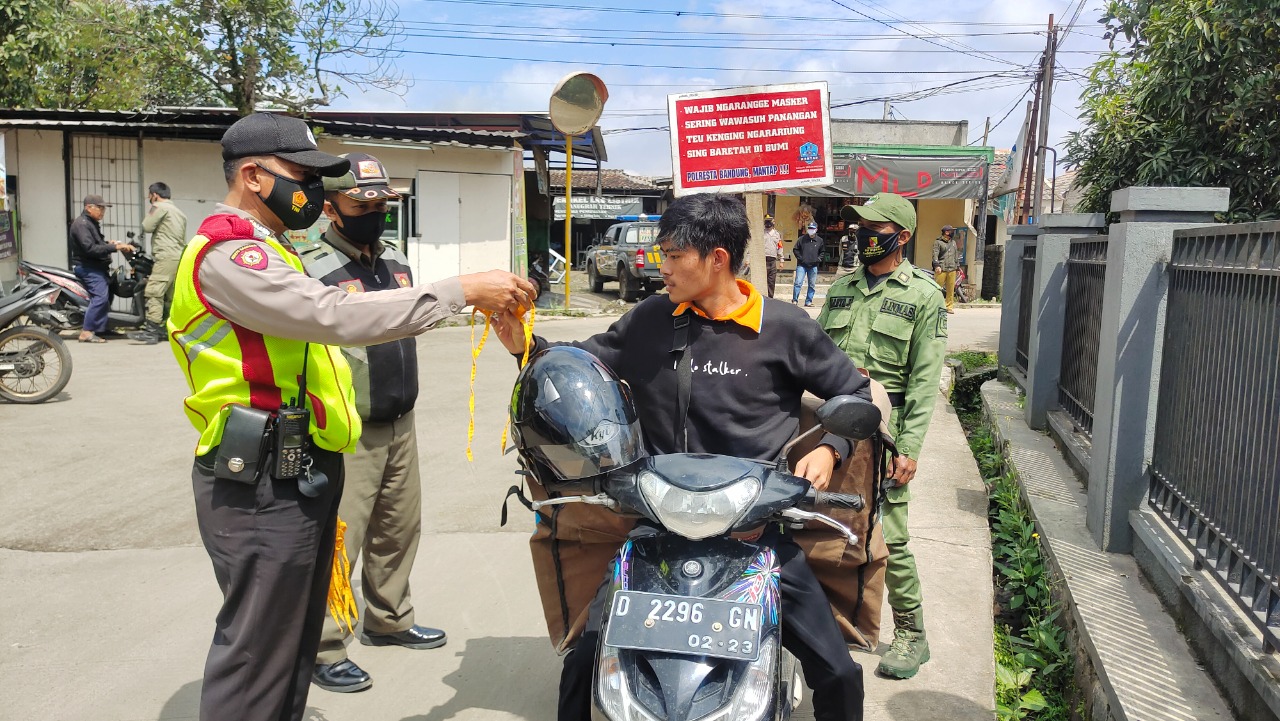 Masker dibagikan oleh petugas kepolisian Polsek Pameungpeuk bersama TNI Satpol PP dan Linmas dari Desa Rancatungk dalam aksinya ini petugas masih menemui banyak warga yang beraktivitas di luar rumah tanpa menggunakan masker.