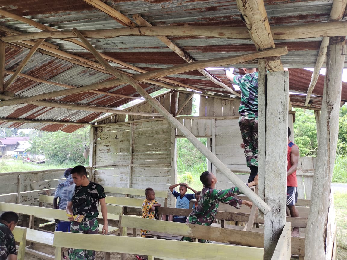 Prajurit Satgas Pamtas Yonif 126/KC yang dipimpin Wadan Pos KM 140 Serda Liki Purba beserta 10 orang anggotanya dengan membawa peralatan bangunan dan peralatan korve seperti cangkul dan sapu, mendatangi Gereja GKI untuk melaksanakan pembenahan dan pembersihan bersama warga.
