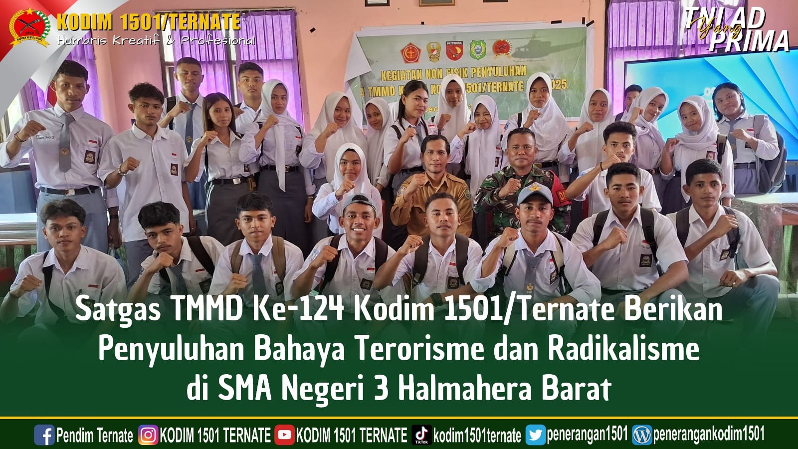 Halmahera Barat – Satgas TMMD Ke-124 Kodim 1501/Ternate melakukan penyuluhan tentang bahaya terorisme dan radikalisme di SMA Negeri 3 Halmahera Barat. Kegiatan ini bertujuan untuk memberikan edukasi dan meningkatkan kesadaran generasi muda tentang bahaya-bahaya yang mengintai. Rabu (28/5/2025).
