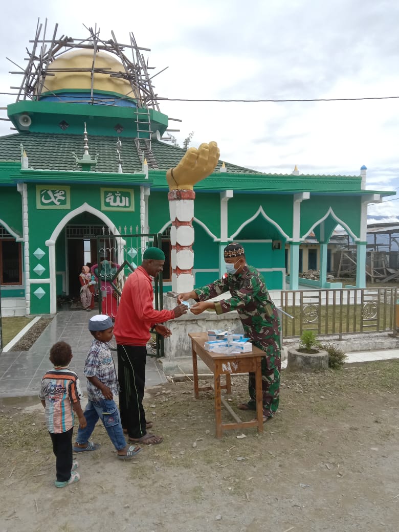 Sebelum peringatan Maulid Nabi Muhammad SAW dimulai, Pasiter Satgas Yonif 751 Letda Inf A. Sirait bersama 3 personel melakukan pengawasan dipintu masuk sekaligus membagikan masker kesehatan dan menyemprotkan hand sanitizer kepada masyarakat yang masuk ke lokasi masjid.